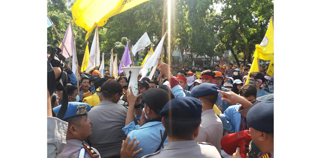 "Apa yang sekarang kita rasakan teman-teman? Korupsi malah merajalela, rakyat semakin susah" teriak orator yang tergencet barikade polisi.