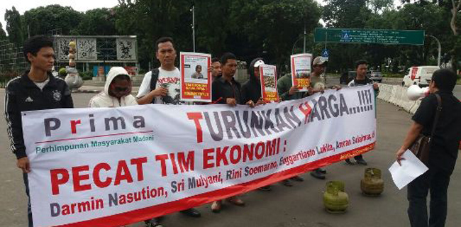 "Turunkan harga-harga. Pecat tim ekonomi; Darmin Nasution, Sri Mulyani, Rini Soemarno dan lain-lainnya karena gagal mewujudkan pertumbuhan ekonomi yang melesat tinggi sebagaimana sesumbar presiden. Pecat direksi Pertamina karena turut bertanggung jawab atas langkanya gas melon sehingga menyebabkan harganya melambung. Segera lakukan oprasi pasar sebanyak-banyaknya untuk mengembalikan harga kembali normal," kata Sya'roni menyampaikan tuntutan.