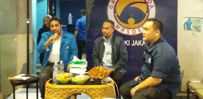 Ngopi Nasional menghadirkan Wakil Ketua Umum DPP KNPI Berto Izzak Doko dan Staf Khusus Menteri PPN/Kepala Bappenas, Velix Pernando Wanggai di pelataran kantor DPW Nasdem Jakarta, Menteng, Rabu (27/12).