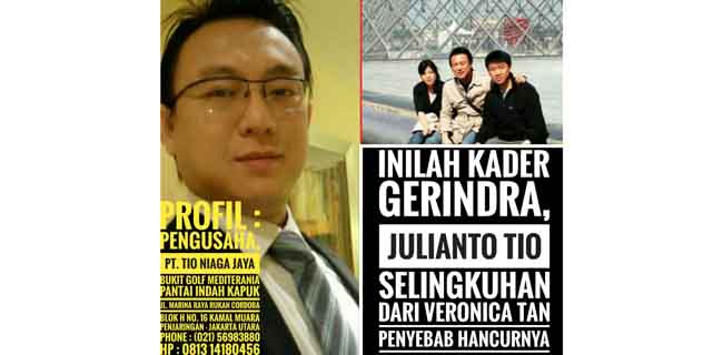 Pria keturunan Tionghoa ini mengenakan kacamata. Wajahnya tirus, hidung mancung dan terlihat lebih muda dari wajah Ahok. Di dalam keterangan foto yang beredar itu juga tertulis jika pria yang bernama Julianto Tio itu merupakan kader Partai Gerindra.