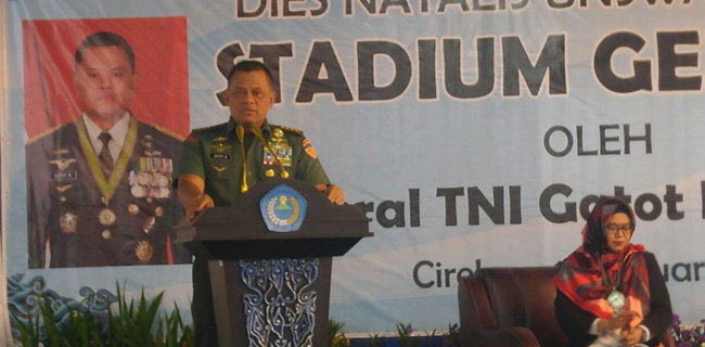 "Sejak tahun 2014 saya sudah mendatangi berbagai universitas. Unswagati adalah kampus ke-63 yang saya datangi, karena saya ingin memberikan wawasan kebangsaan kepada para pemuda yang akan meneruskan bangsa Indonesia. Mereka yang akan menjaga Negara Kesatuan Republik Indonesia," ungkap Gatot, saat mengisi Studium General di Dies Natalis Unswagati ke-57 di halaman Kampus I Unswagati Cirebon, Selasa (16/1).