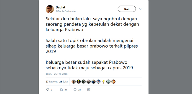 Dalam kultwittnya dia menyebut ada pertimbangan besar yang membuat keluarga besar sepakat minta Prabowo tidak maju capres 2019. Keluarga tidak ingin kehilangan Prabowo.