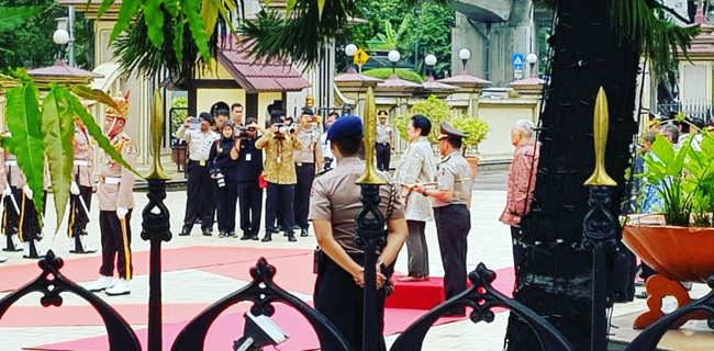 Prosesi penyambutan lengkap dengan pasukan penyambut dari personel Polri, serta kelompok marching band.