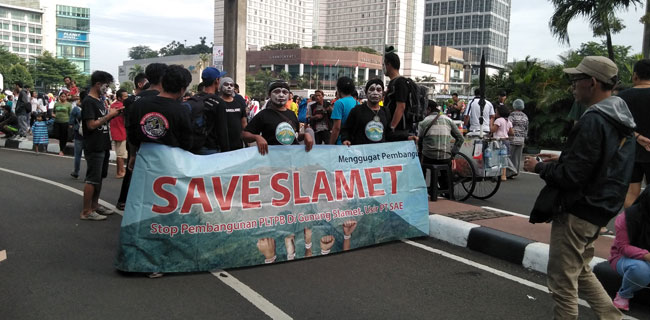 Dalam aksinya mereka membentangkan spanduk bertuliskan "Save Slamet; Stop Pembangunan PLTPB Di Gunung Slamet, Usir PT SAE".