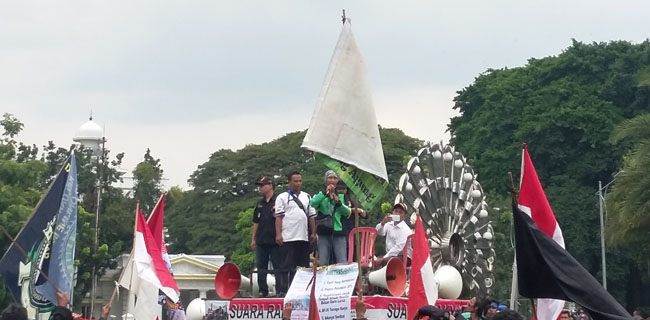Dari atas mobil komando, sang orator menuntut pemerintah melakukan rasionalisasi tarif ojek online.