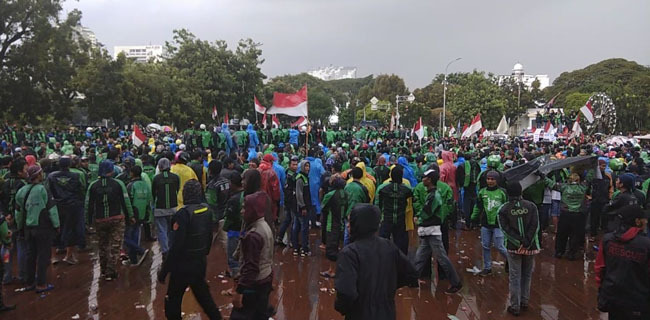 Aksi yang dimulai sejak pukul 11.00 WIB hingga berita ini diturunkan masih berlangsung. Mereka menuntut rasionalisasi tarif jasa transportasi online.