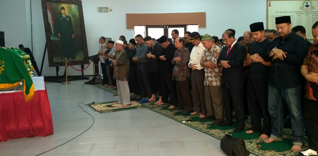 Selain dua tokoh tersebut, putra almarhum yang juga artis Anjasmara juga tampak khusuk saat menyalatkan sang ayah.