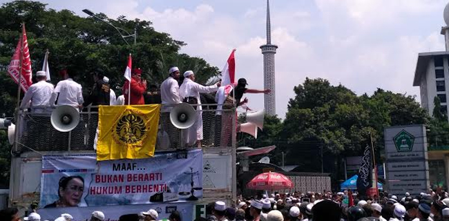 "Aku tak tahu syariat Islam, yang ku tahu adalah suara kidung Indonesia adalah sangatlah elok, lebih elok dari lantunan suara adzan. Yeee... Bu Suk, yeee... Kecebong Monas. Kalau enggak tahu, tanya kyai, tanya habib, tanya ustad. Kan banyak," kata pria yang memakai jubah putih ini yang disambut tawa sepuluh ribuan pendemo.