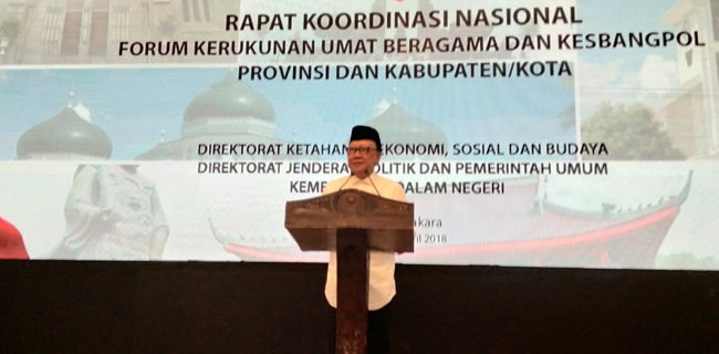 Rakornas FKUB yang mengangkat tema "Peningkatan Peran dan Fungsi dalam Rangka Menjaga Harmoni Kebangsaan Guna Mendukung Suksesnya Pelaksanaan Pilkada Serentak Tahun 2018 dan Persiapan Pemilu Tahun 2019" digelar di Birawa Assembly Hall, Hotel Bidakara Jakarta, Gatot Subroto, Jakarta Pusat, Rabu (18/4).