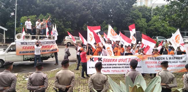 Puluhan orang tersebut menyerbu markas Agus Rahadjo Cs berkantor untuk mendesak KPK segera mengusut tuntas dugaan korupsi terkonstruksi di jajaran direksi PT Pos Indonesia.