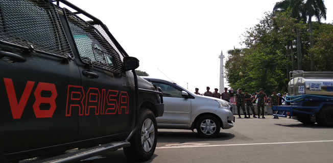 Sementara petugas gabungan TNI, Polri Satpol PP dan Dinas Perhubungan memantau di persinggungan Jalan Medan Merdeka Barat dan Jalan MH. Thamrin.