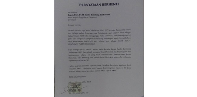 Telerbih dahulu, saya beroda ke hadirat Allah SWT, semoga Bapak sehat selalu dan bahagia dalam lindungan-Nya. Selanjutnya, agar kegiatan saya sebagai Ketua Umum ReJO tidak mengganggu Partai Demokrat, pada kesempatan ini perlu saya sampaikan dengan bahasa terang dan dengan segala hormat bahwa saya menyatakan berhenti dari jabatan sebagai wakil ketua pengawas Partai Demokrat.