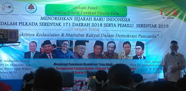 Sebagaimana tertera dalam spanduk besar diskusi, mereka adalah Kepala Pelaksana Unit Kerja Presiden bidang Pembinaan Ideologi Pancasila (UKP-PIP) Yudi Latief, Kepala Staf Presiden Jenderal TNI (Purn) Moeldoko, Ketua Umum PPP Muhammad Romahurmuziy, mantan Ketua MK Mohammad Mahfud MD, Salahuddin Wahid, dan Ahmad Buya Syafii Maarif,