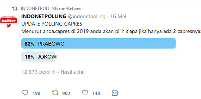 Adapun pertanyaaan yang disampaikan admin akun @indonetpolling, "menurut anda, capres di 2019 anda akan pilih siapa jika hanya ada 2 capresnya?".