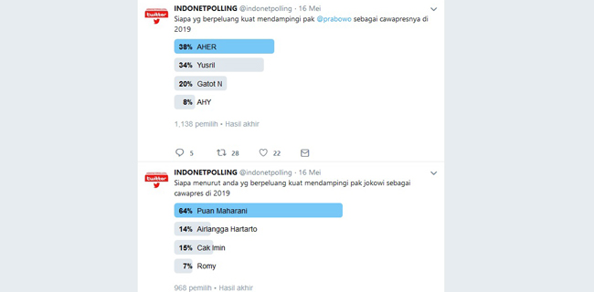 Akun twitter Indonesia Netizen Polling @indonetpolling melakukan penjajakan siapa sosok yang pas dan cocok mendampingi Jokowi dan Prabowo.