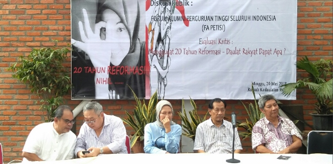 Begitu penilaian aktivis Sri Bintang Pamungkas saat diskusi bertema 'Menggugat 20 Tahun Reformasi-Daulat Rakyat Dapat Apa?' di Rumah Kedaulatan Rakyat, Setia Budi, Jakarta Selatan, Minggu (20/5).