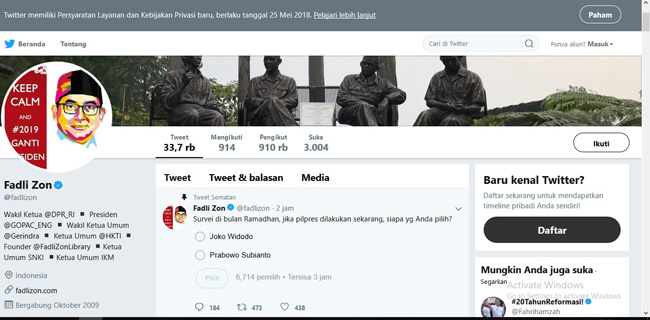 "Jika pilpres (pemilihan presiden) dilakukan sekarang, siapa yang Anda pilih?" tulis dalam polling Fadli.
