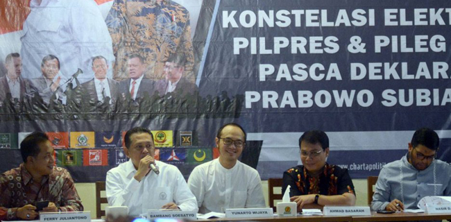 Berikut elektabilitas parpol peserta Pemilu 2019 berdasarkan hasil survei Charta Politika: PDIP 24,9 persen, Gerindra 12,3 persen, Golkar 11 persen, PKB 7 persen, Demokrat 5 persen, Perindo 4 persen.