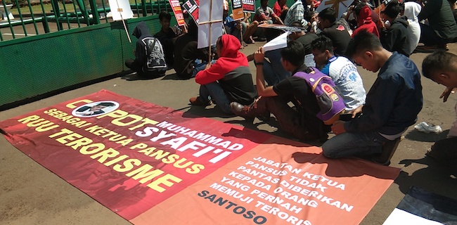 Dalam aksi ini mereka membentangkan spanduk bertuliskan "Copot Muhammad Syafi'i Sebagai Ketua Pansus RUU Terorisme: Jabatan Ketua Pansus Tidak Pantas Diberikan Kepada Orang Yang Pernah Memuji Teroris Santoso".