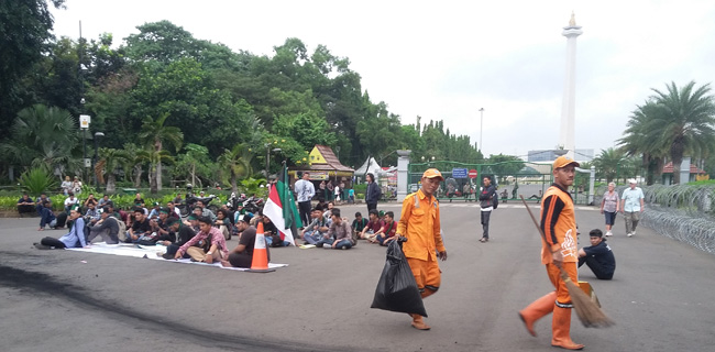 Ada beberapa Petugas Prasarana dan Sarana Umum (PPSU) wilayah Gambir, yang langsung membersihkan sisa ban bekas terbakar di tengah kerumunan demo.