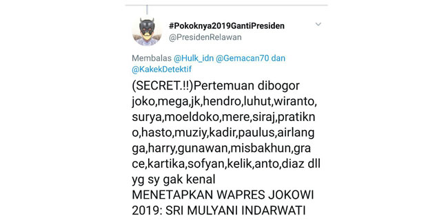 "(SECRET.!!) Pertemuan di Bogor joko, mega, JK, hendro, luhut, wiranto, surya, moeldoko, mere, siraj, pratikno, hasto, muziy, kadir, paulus, airlangga, harry, gunawan, misbakhun, grace, kartika, sofyan, kelik, anto, diaz dll yg sy gak kenal MENETAPKAN WAPRES JOKOWI 2019: SRI MULYANI INDARWATI," kicaunya.