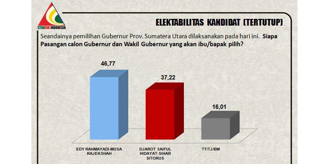 Hasil survei menunjukan pasangan Edy Rahmayadi-Musa Rajekshah (Eramas) unggul jauh dari pasangan Djarot Syaiful Hidayat-Sihar Sitorus (Djoss). Elektabilitas Eramas mencapai 46,77 persen sementara Djoss mencapai 37,22 persen. Adapun yang menyatakan rahasia, tidak tahu, tidak menjawab sebanyak 16,01 persen.