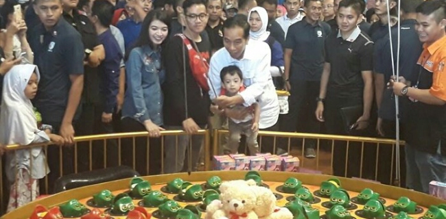 Jokowi yang bekemeja putih dipadu celana panjang hitam menggendong Jan Ethes berkemeja kotak-kotak berwarna hitam-cokelat-putih menuju wahana permainan anak.