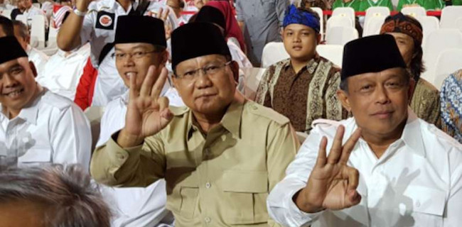 Prabowo datang dengan mengenakan pakaian khasnya, yaitu kemeja berwarna krem dan peci hitam. Ketua DPD Partai Gerindra Mulyadi setia berada di samping Prabowo.