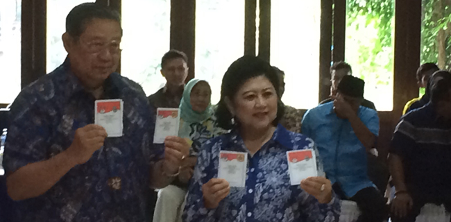Pada momen pencoblosan kali ini, SBY disertai Ani Yudhoyono dan putranya Edhy Baskoro bersama sang istri.