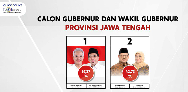 Berdasarkan penghitungan cepat Saiful Mujani Research and Consulting (SMRC) dari 70 persen suara yang masuk, Ganjar-Taj memperoleh 57,92 persen. Diikuti pasangan nomor urut dua, Sudirman Said-Ida Fauziyah sebesar 42,08 persen.