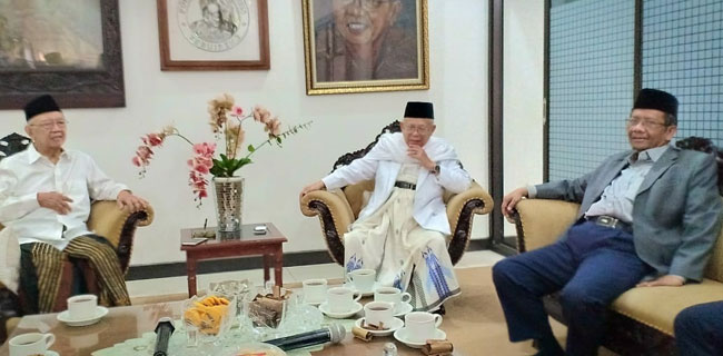 Mantan Menteri Pertahanan era Presiden Gus Dur ini nampak khusyuk berdoa di depan makam cucu pendiri organisasi Islam terbesar di Indonesia, Nahdlatul Ulama (NU), Hadratusyaikh KH Hasyim Asy'ari bersama Gus Sholah dan Rais Aam Pengurus Besar Nahdlatul Ulama (PBNU) KH Ma'ruf Amin. Setelah selesai tahlilan dan berdoa, Mahfud diajak foto bareng peziarah. Pria kelahiran Sampang, Madura ini pun dengan ramah meladeni ajakan selfie peziarah.