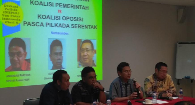 Djayadi Hanan menjadi salah satu pembicara dalam diskusi Vox Point Indonesia bertajuk 'Menakar Kekuatan Koalisi Pemerintah Vs Koalisi Oposisi Pasca Pilkada Serentak' di kawasan Pasar Baru, Jakarta Pusat.