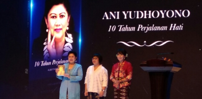 Istri dari Presiden RI ke-6 Susilo Bambang Yudhoyono, Ani Yudhoyono meluncurkan buku yang berjudul "10 Tahun Perjalanan Hati" di Assembly Hall Jakarta Convention Center, Senayan, Jakarta, Minggu (8/7).