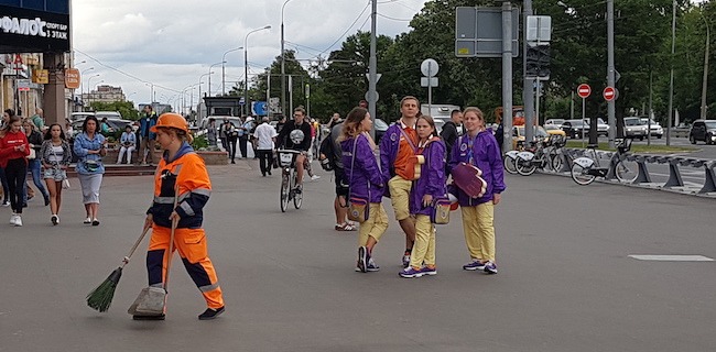 Kehadiran para remaja yang direkrut oleh panitia penyelenggara tampak mulai dari terminal kedatangan Bandara Domodedovo, Stasiun Kereta Moskow, dan beberapa tempat strategis lainnya.