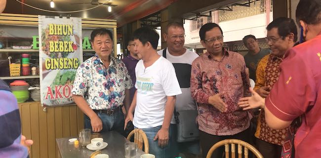 Tak dinyana-nyana, sejumlah orang yang tengah nongkrong di kedai-kedai komplek pertokoan bangunan jaman dulu khas akulturasi Tionghoa Eropa ini, langsung menyerbu Mahfud MD.