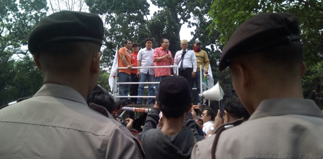 Meski bukan dari agenda resminya ke MK, RR pun tetap menyanggupi permintaan koordinator aksi yang datang lebih awal.