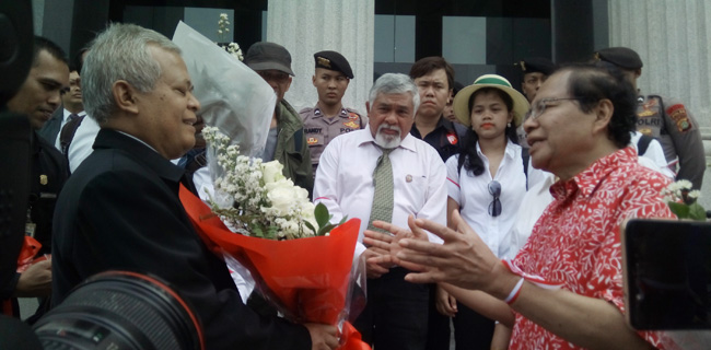 Rizal Ramli (RR) menyerahkan karangan bunga kepada Kepala Biro Humas dan Protokol Konstitusi, Rubiyo di depan gedung Mahkamah Konstitusi, Jakarta Kamis siang (12/7). Penyerahan bunga itu sebagai bentuk apresiasi RR atas sikap dua hakim konstitusi, Saldi Isra dan Suhartoyo terkait uji materi ketentuan ambang batas pencalonan presiden atau presidential threshold (PT) sebesar 20 persen dalam UU 7/2017.