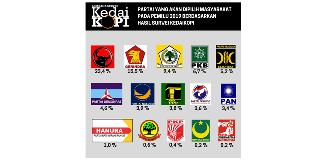 Seperti hasil survei KedaiKOPI (Kelompok Diskusi dan Kajian Opini Publik Indonesia) saat responden diajukan pertanyaan, partai politik mana yang akan dipilih pada Pemilu 2019.