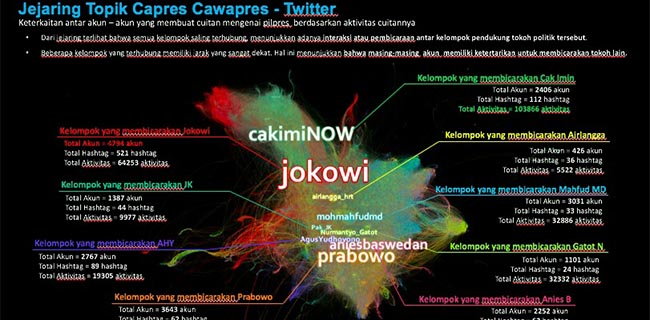 Berdasarkan kajian Indonesia Indicator (I2) ada tiga kelompok yang masing-masing dikoneksikan dengan pembicaraan calon presiden dari seluruh jejaring di media sosial Twitter. Kelompok pertama adalah koalisi Jokowi, kedua kelompok yang netral, ketiga adalah kelompok kedekatan dengan Prabowo.