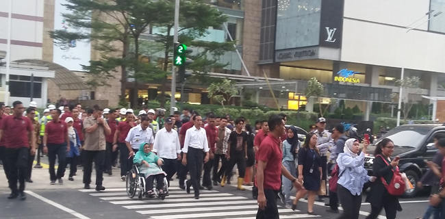 "Mumpung dekat Asian Games 2018, mari kita kumandangkan: biasakan jalan kaki yang sehat untuk masyarakat," ucap Jokowi.
