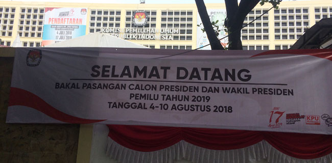 Belum ada tanda-tanda para capres-cawapres mendaftar hari ini. Sementara di gerbang KPU sudah terpampang spanduk selamat datang.