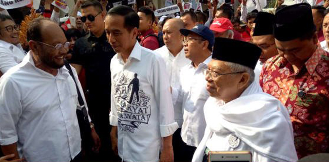 Jokowi dan Ma'ruf mengenakan pakain warna putih. Khusus Ma'ruf, ketua umum MUI itu mengenakan peci hitam, sorban putih dan sarung hijau.