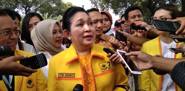 Disinggung wartawan, apakah alasan mendukung Prabowo karena Golkar memberikan dukungan kepada petahana Joko Widodo, Titiek membantah.