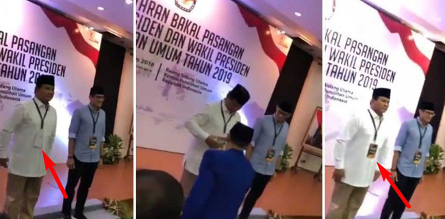 Peristiwa itu terjadi di Ruang Sidang Gedung Komisi Pemilihan Umum (KPU) di Jalan Imam Bonjol Nomor 29, Jakarta Pusat, Jumat (10/8) siang. Ceritanya Prabowo dan Sandi baru saja menyerahkan dokumen persyaratan ke KPU.