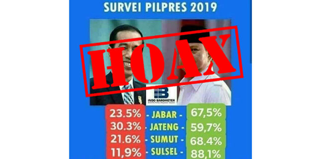 Meme hasil survei Pilpres 2019 mengatasnamakan Indo Barometer ramai di medsos dan terus menyebar di group-group Whatsapp dua hari ini. Dalam meme tersebut terdapat foto Jokowi dan Prabowo dengan hasil survei di Provinsi Jawa Barat, Jawa Tengah, Sumatera Utara, Sulawesi Selatan.