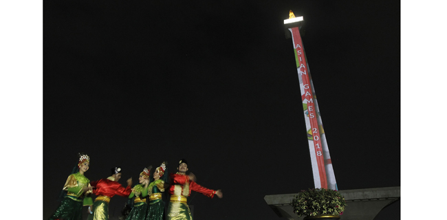 Penari berswafoto saat video Mapping Tugu Monas persembahan Pemprov DKI Jakarta untuk Asian Games 2018, di Silang Barat Monas, Jakarta Pusat, Senin malam (13/8). Video permainan cahaya menampilkan informasi sejarah Asian Games, sejarah dan budaya Kota Jakarta dan Palembang untuk dinikmati pengunjung Monas selama perhelatan Asian Games 2018. Dwi Pambudo/RM