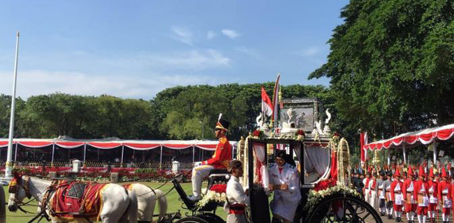 Parade semakin megah dengan dentuman musik. Terlihat di belakang kereta kencana ada 45 anggota Paspampres yang mengenakan busana prajurit dan pasukan berkuda.