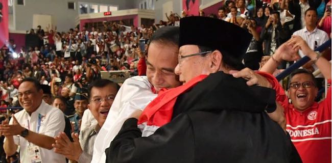 Dengan berjubah bendera merah putih, dia merangkul dua tokoh yang akan bertarung di Pilpres 2019, Prabowo dan Jokowi.