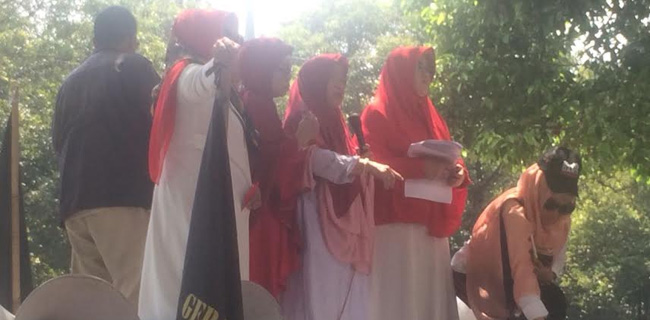 Barisan emak-emak militan alias BEM menggelar unjuk rasa di depan Gedung Komisi Pemilihan Umum (KPU) Jalan Imam Bonjol, Jakarta Pusat, Senin (3/9).