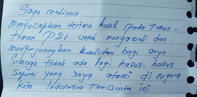Usai kunjungan tersebut, Meiliana mengucapkan rasa terima kasih atas perhatian PSI. Rasa terima kasih itu dituangkan Meiliana dalam secarik kertas.
